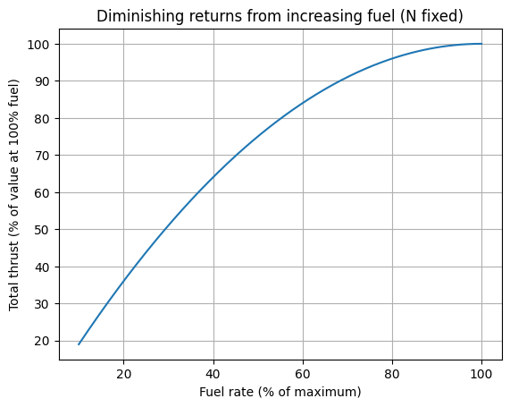 Increasing fuel raises thrust, but each extra percent of fuel gives a smaller gain than the last.
