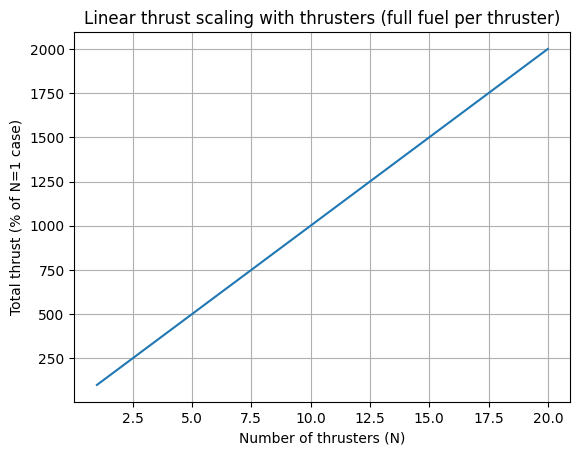 When each thruster is fully fueled, total thrust scales linearly with the number of thrusters.